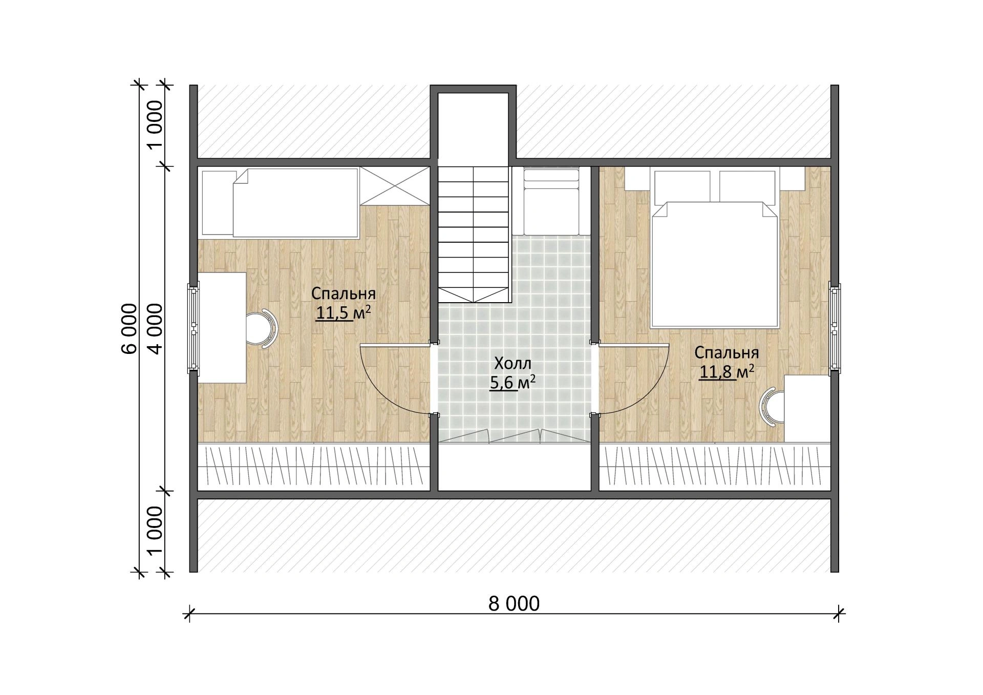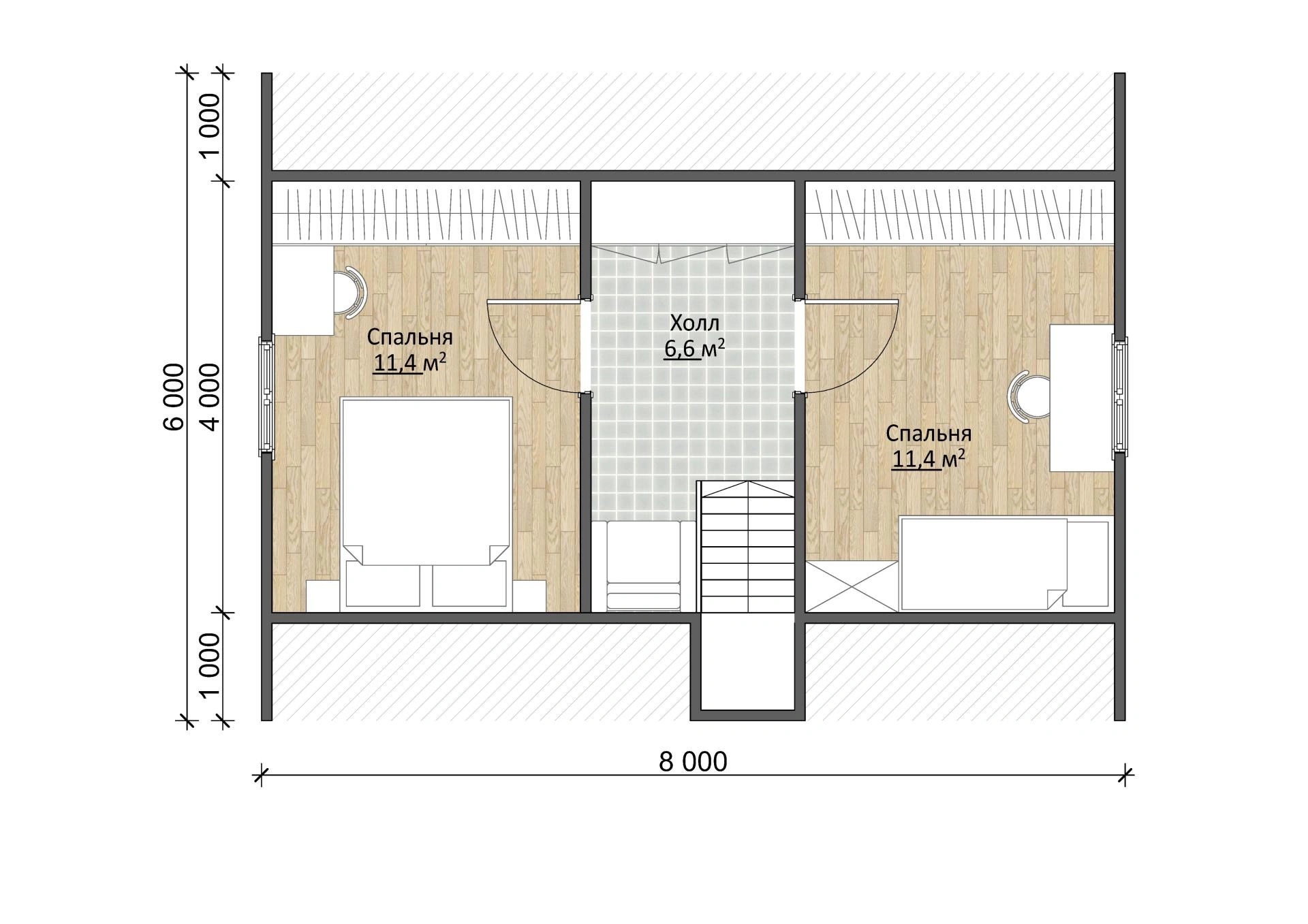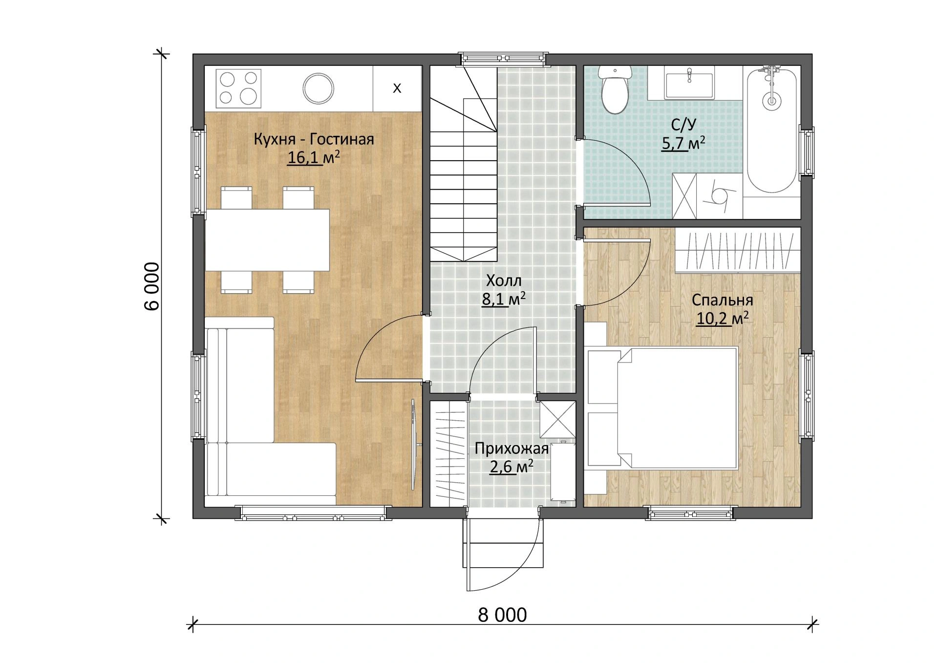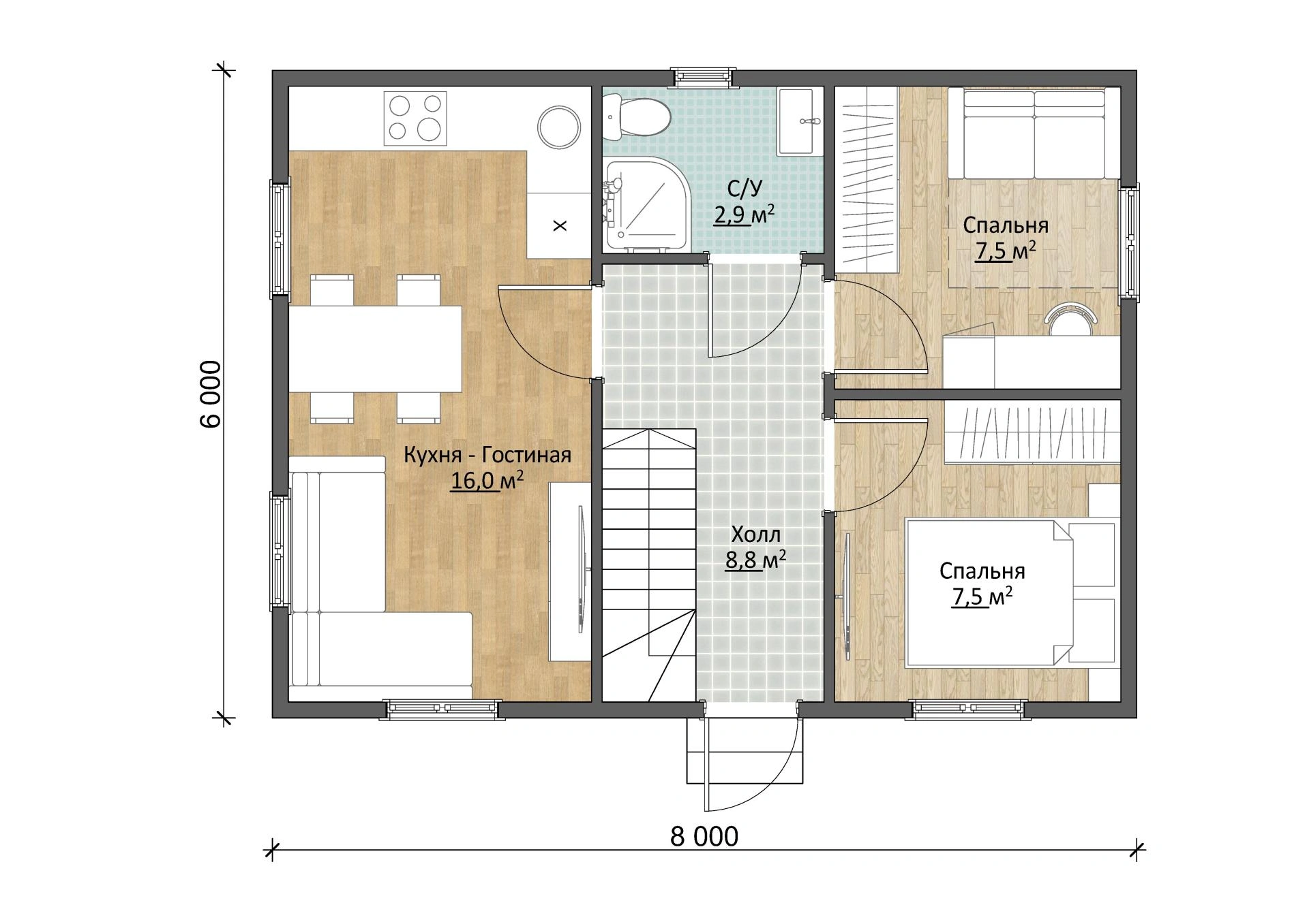 Надежный брусовый дом Дачник 6х8 площадью 71,5 м2 выполнен из натурального материала. Брус долговечен и устойчив к воздействию природных сил. Это означает, что он простоит в первозданном виде несколько десятков лет и достанется вашим детям и внукам!