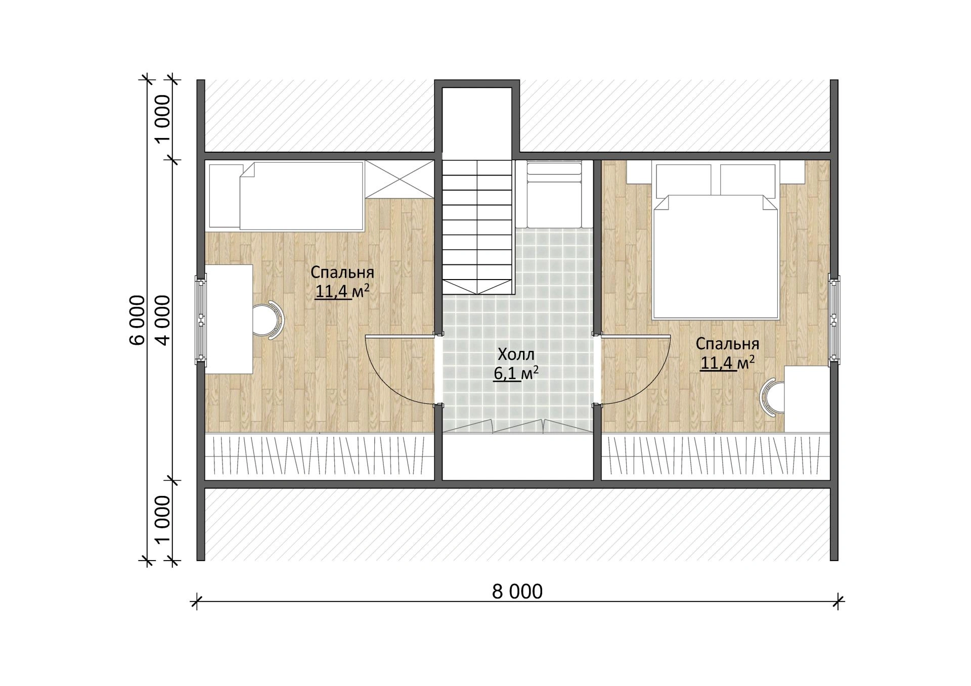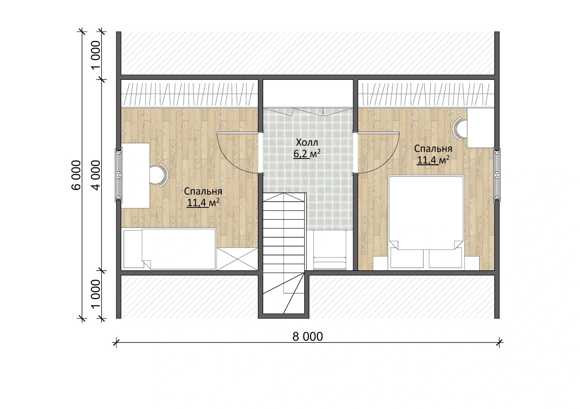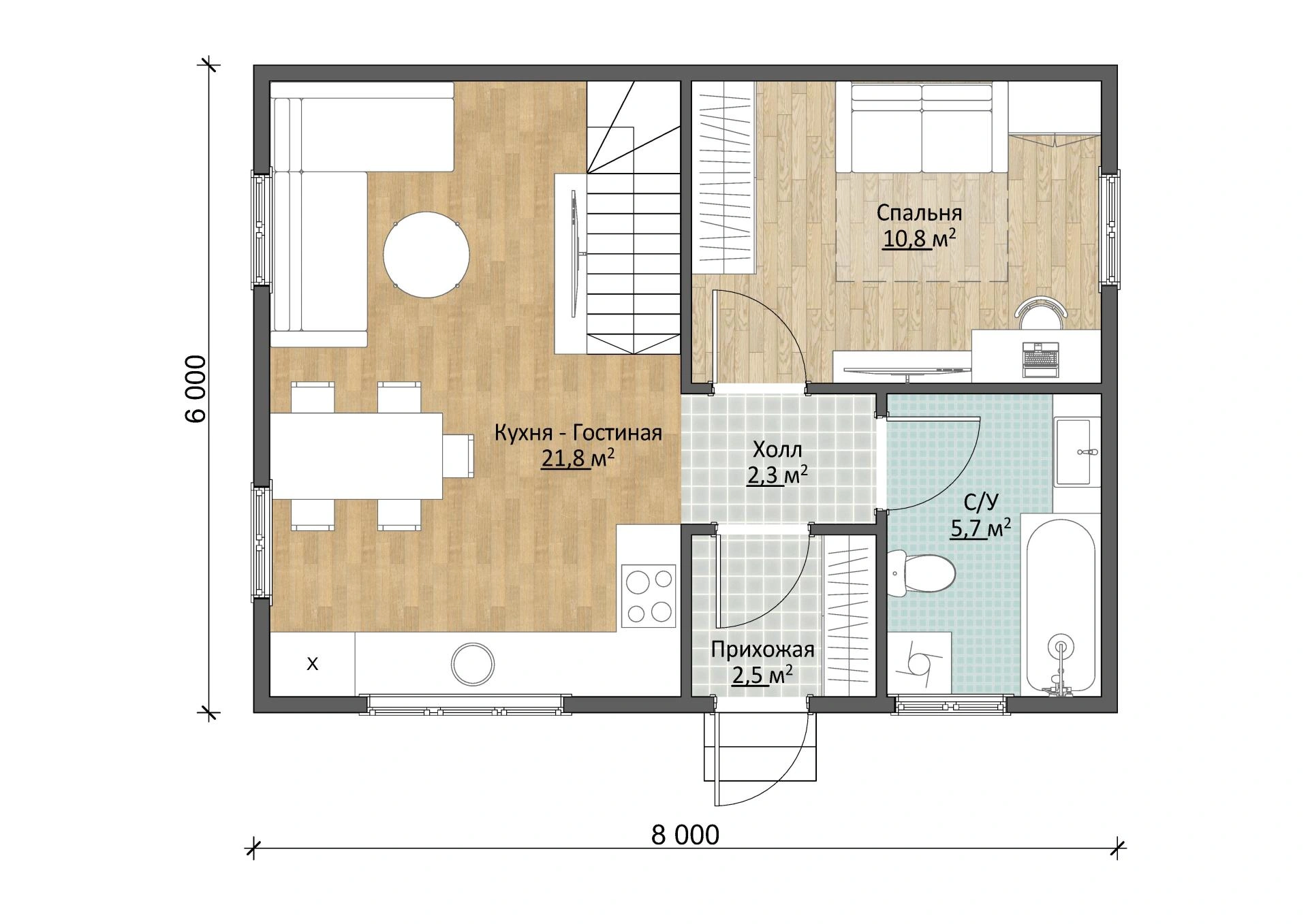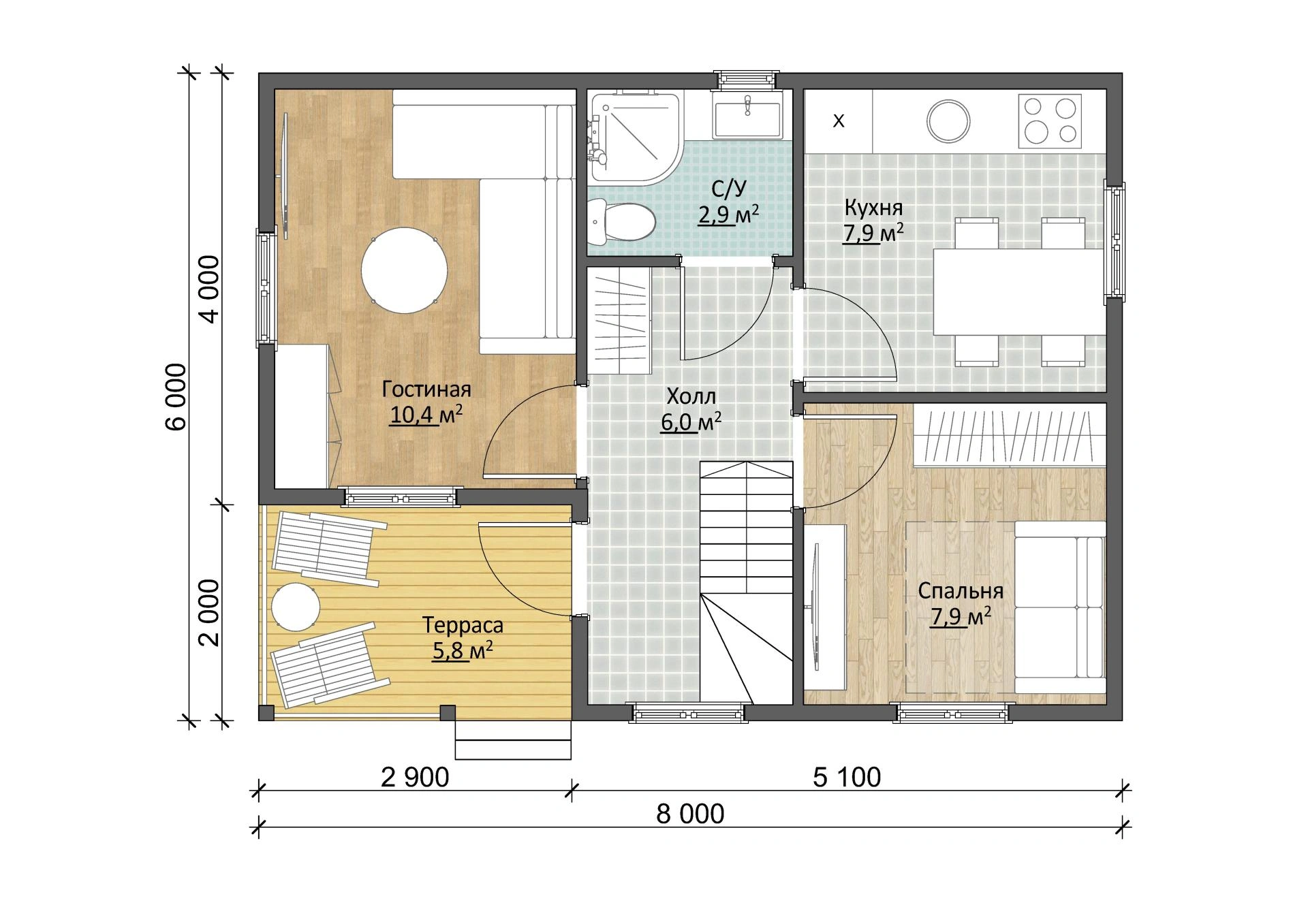 Надежный брусовый дом Дачник 6х8 площадью 71,5 м2 выполнен из натурального материала. Брус долговечен и устойчив к воздействию природных сил. Это означает, что он простоит в первозданном виде несколько десятков лет и достанется вашим детям и внукам!