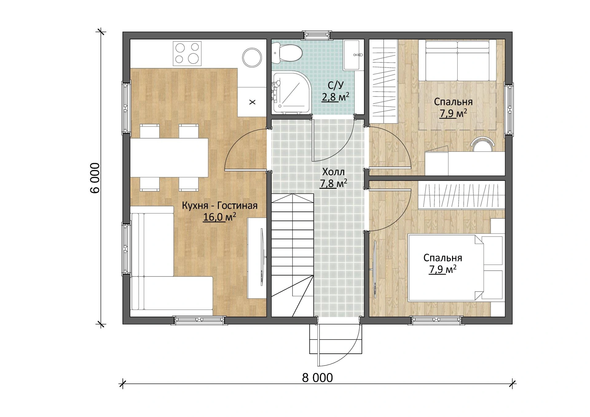 Внизу расположена просторная 16-метровая кухня-гостиная, в которой удобно готовить и собираться большой компанией. В примыкающей прихожей на первом этаже разместятся шкафы. Рядом есть небольшой санузел. В помещении между спальнями наверху можно оборудовать еще одно место для хранения.