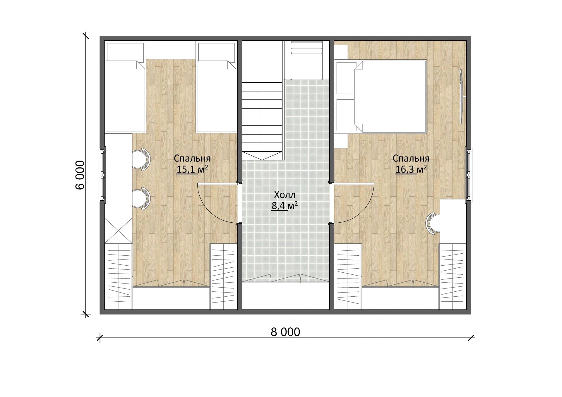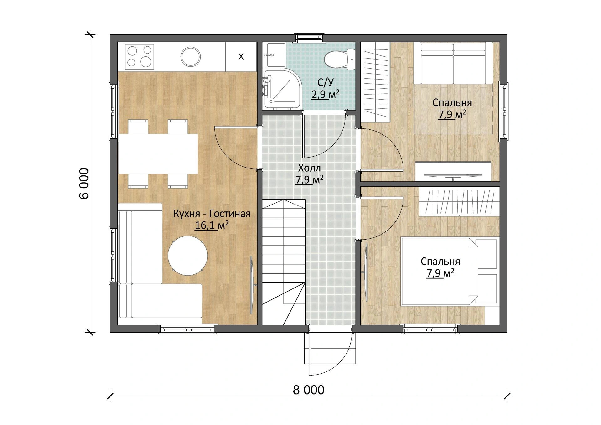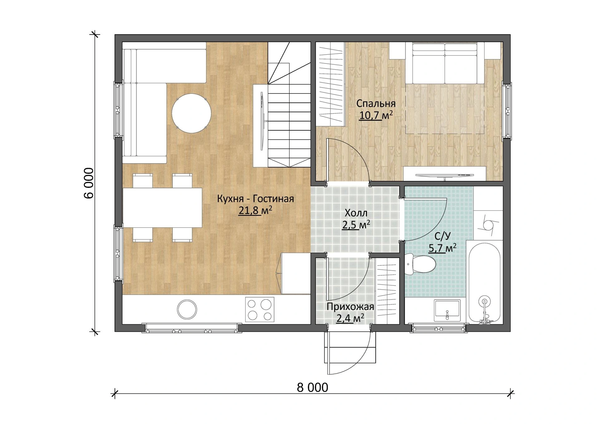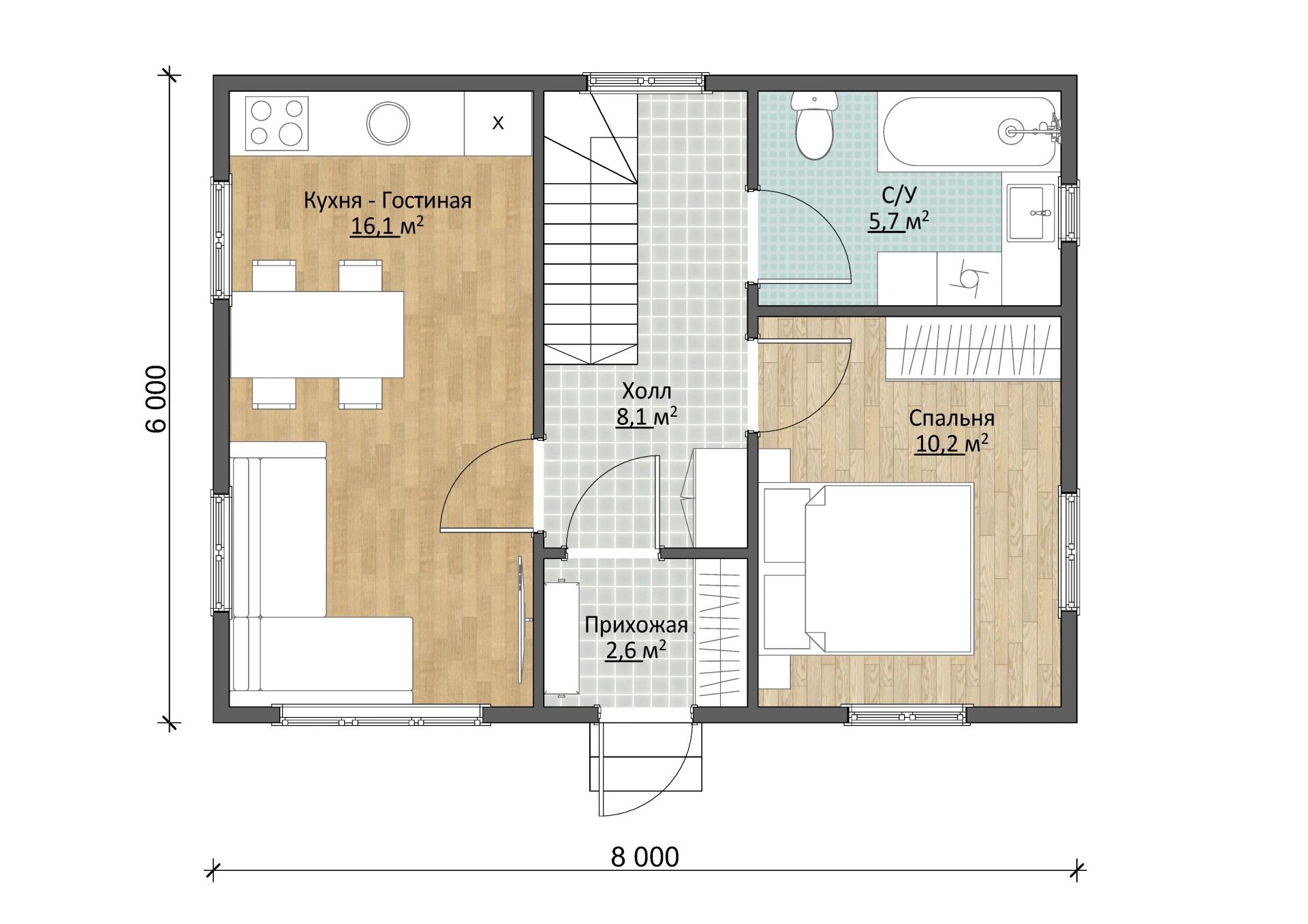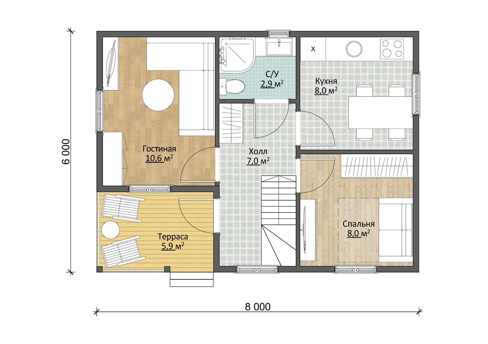 Дачный дом 6х8 из бруса прослужит вам многие годы. Его прочная структура выдерживает любые погодные условия и изменения почвы.