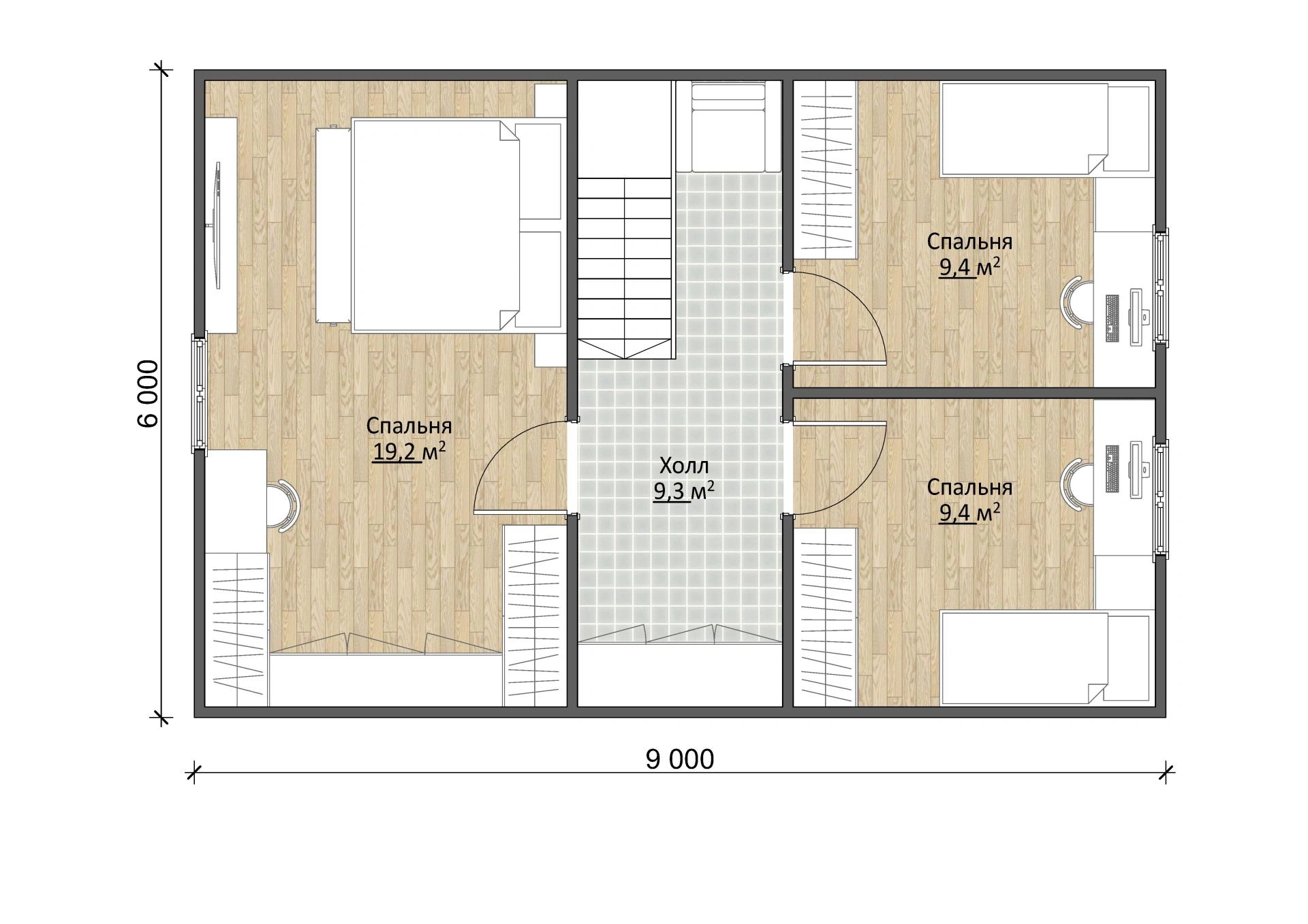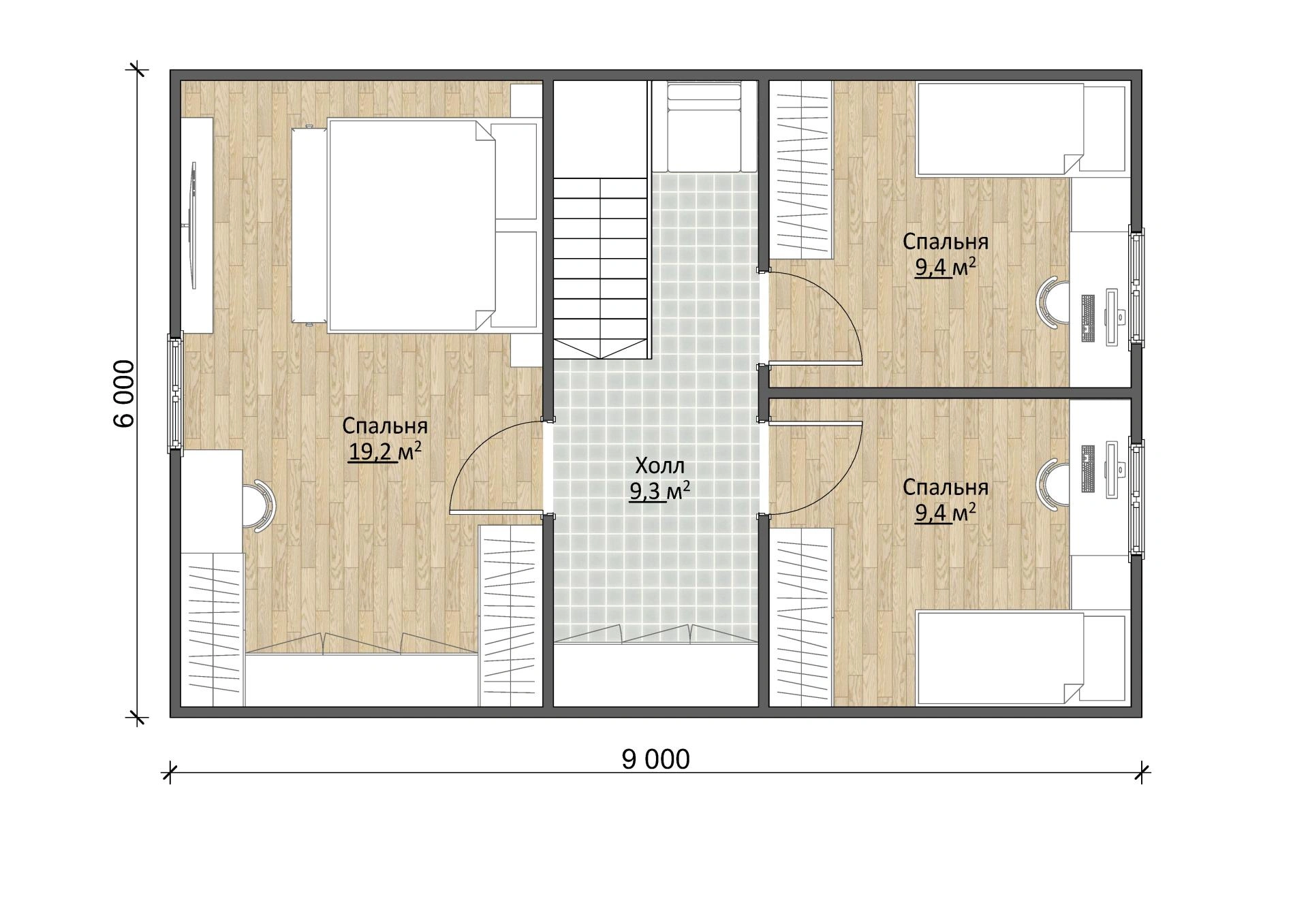 Двускатная кровля дома выглядит легкой и воздушной. Планировок целых пять, и они предусматривают наличие просторной кухни, гостиной, санузла и нескольких спален. Мансардная кровля позволяет сделать на втором этаже 3 полноценных помещения — спальню, детскую или кабинет. Выбирайте одну из двух комплектаций — Стандарт или Люкс. Они отличаюся фундаментом, толщиной утеплителя и окнами.