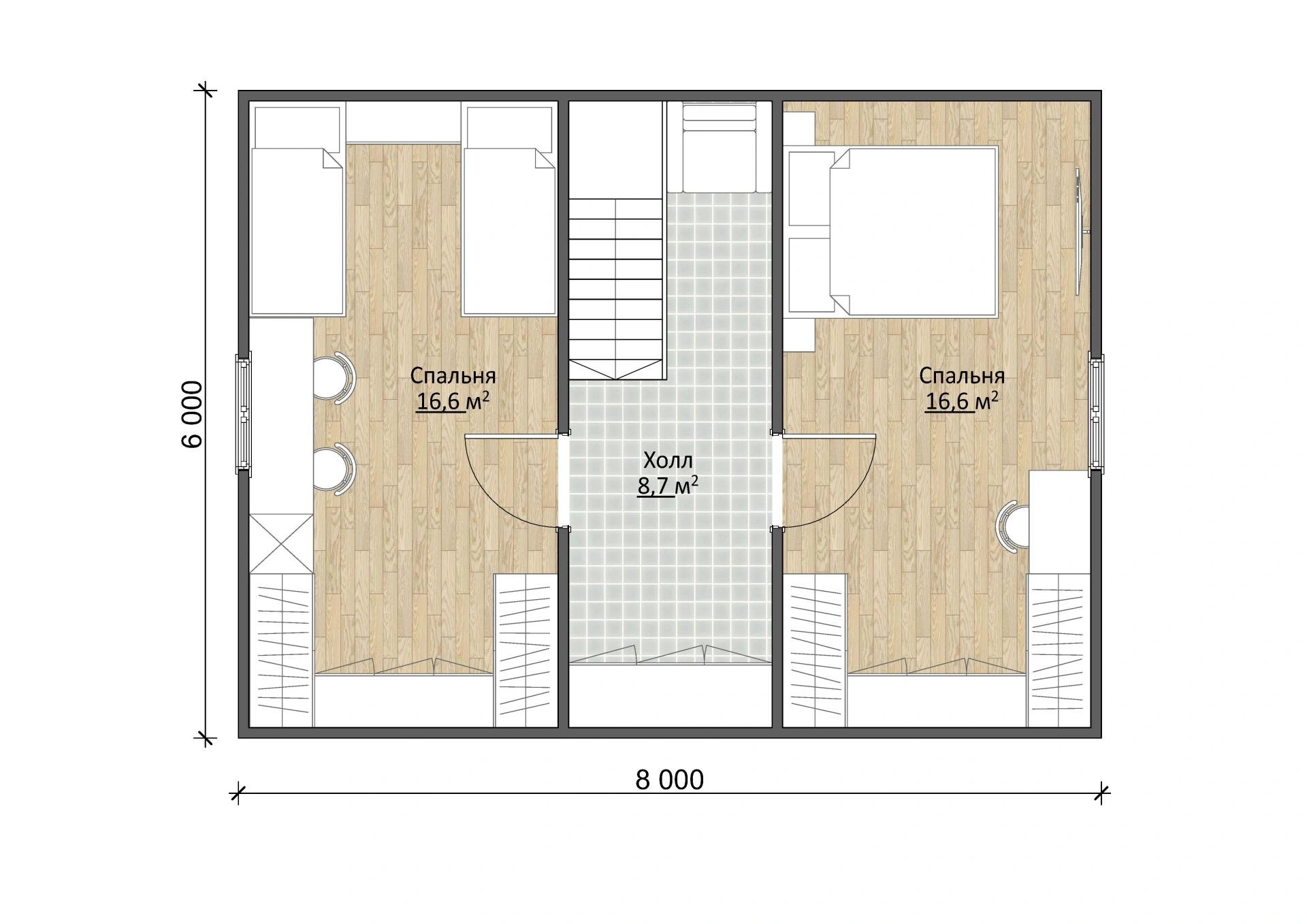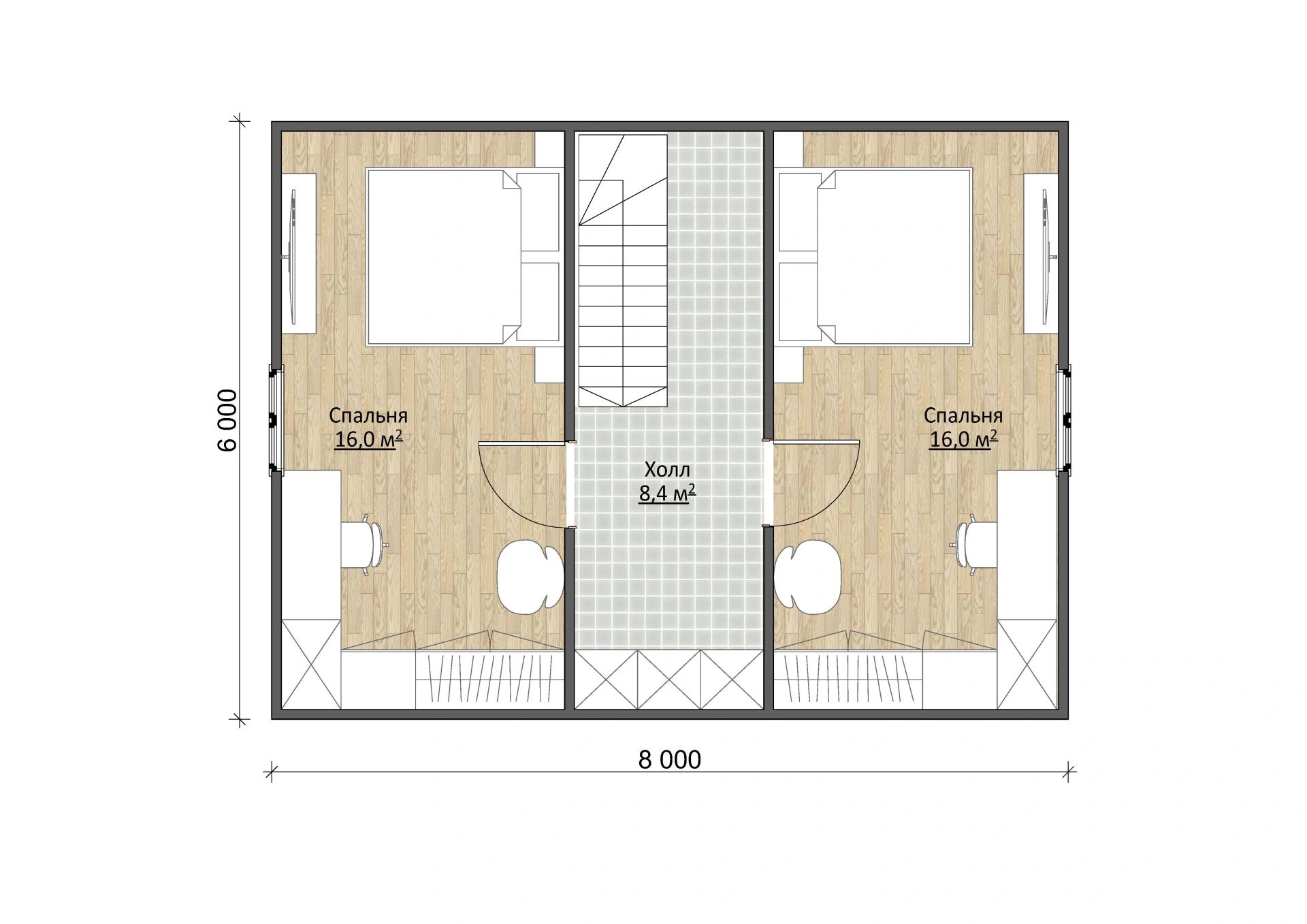 Наверху располагаются две изолированные 16-метровые комнаты, которые можно превратить в гостевую и детскую. В холл второго этажа отлично впишется гардеробная. При обсуждении проекта есть возможность дополнить проект инженерными коммуникациями, оборудовать дом системой отопления, выбрать утепление, покраску, отделку стен, а также пристроить террасу или веранду.