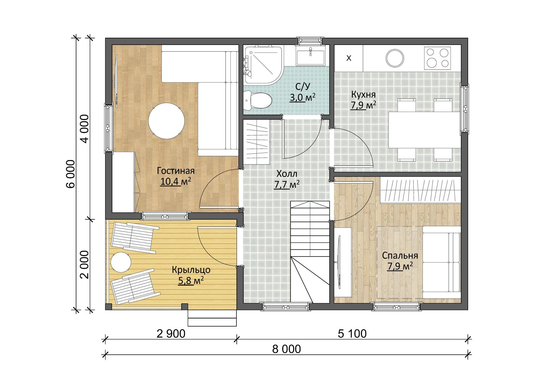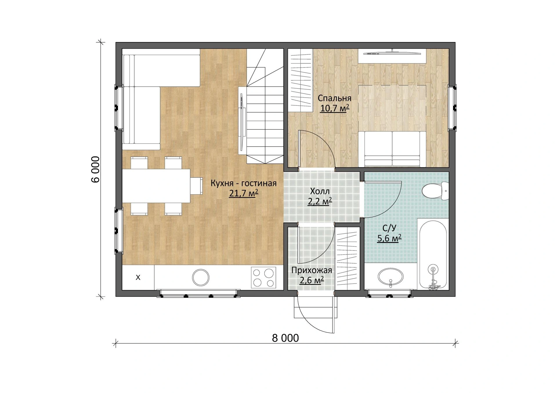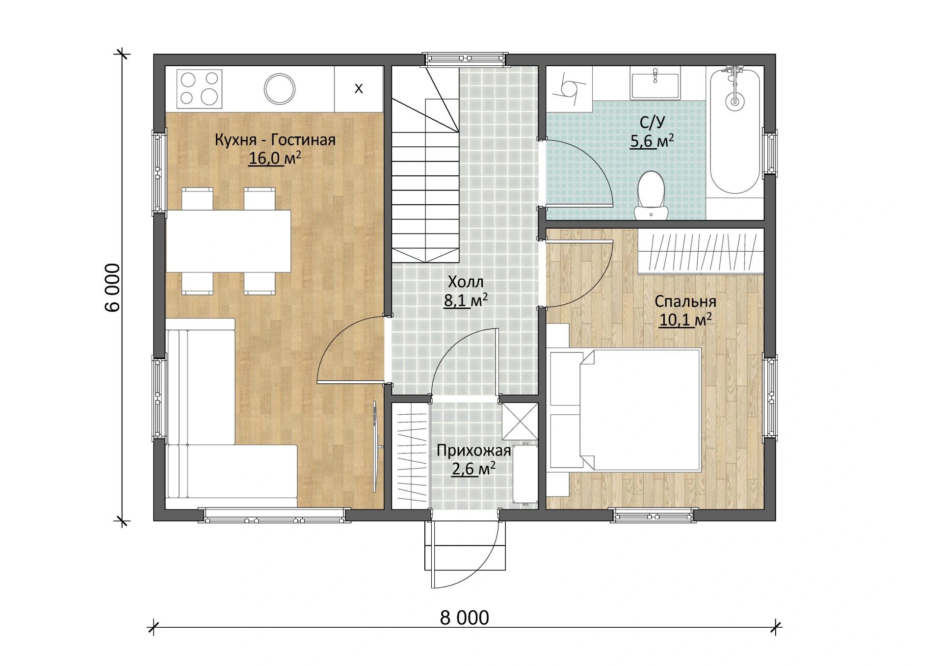 На первом этаже дома расположен холл площадью 7,7 м², куда свободно помещаются шкафы и стеллажи для хранения одежды и прочих необходимых вещей. Функциональный санузел площадью 3,1 м², куда можно установить унитаз, раковину и душевую кабину.