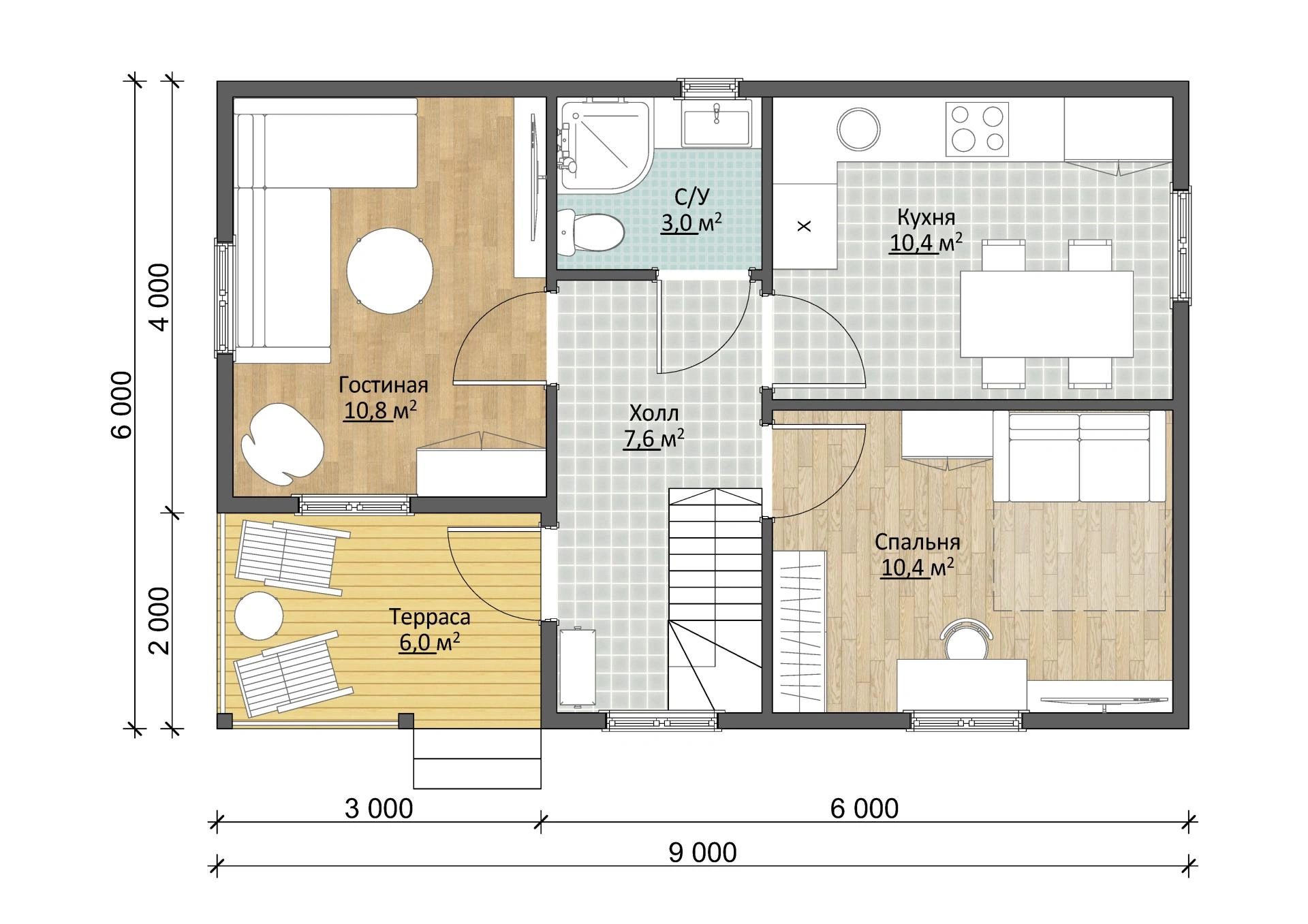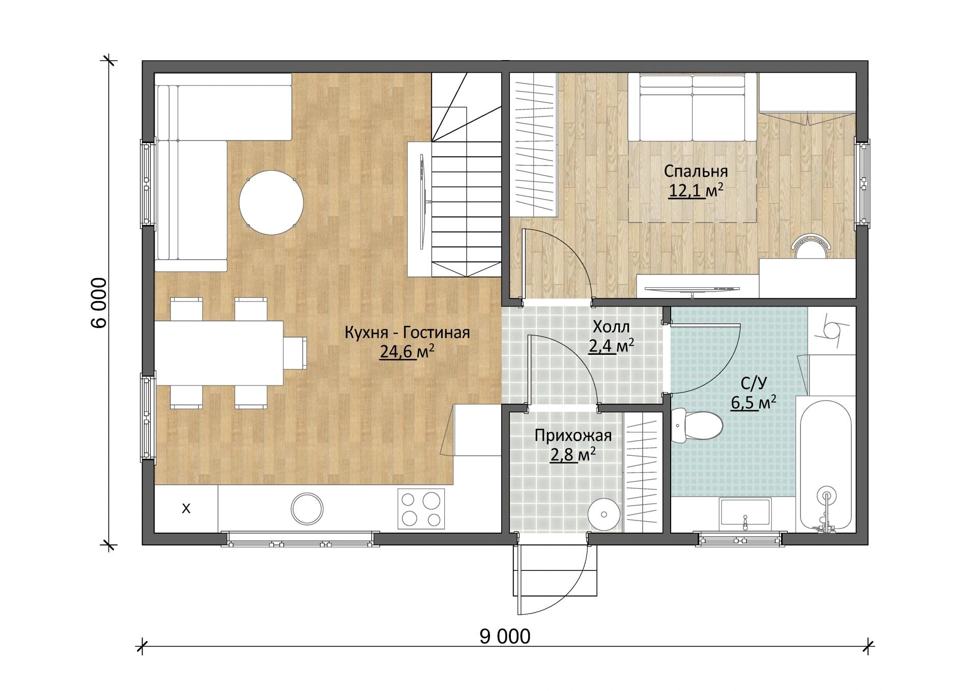 На первом этаже на входе вас встречает тепловой тамбур. Далее вы попадаете на 27-метровую кухню, совмещенную с гостиной – мечта хозяйки! Изолированная комната площадью 12,1 м² будет удобной спальней или кабинетом. Рядом есть санузел площадью 6,5 м².
