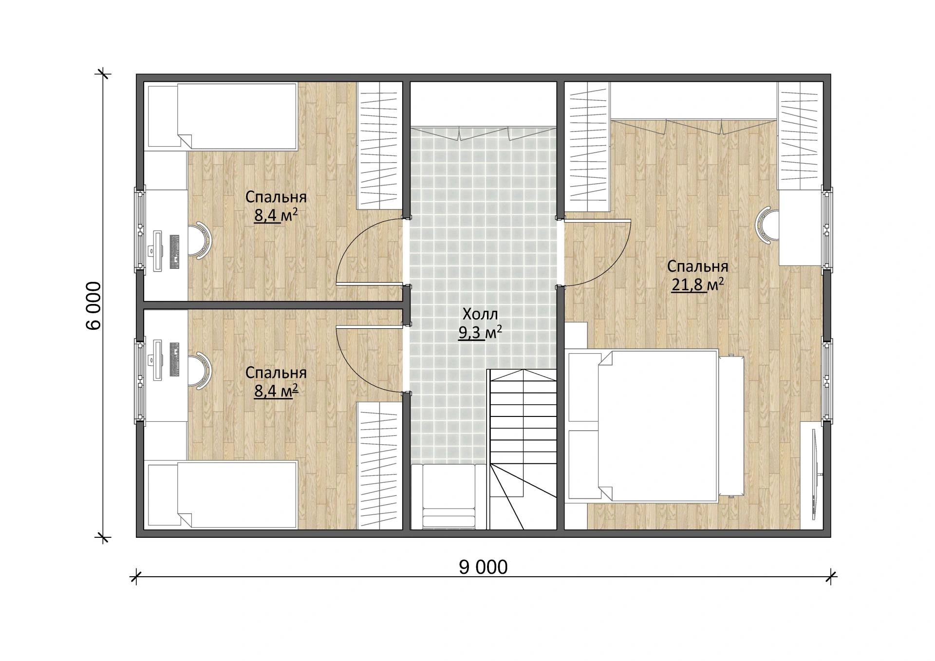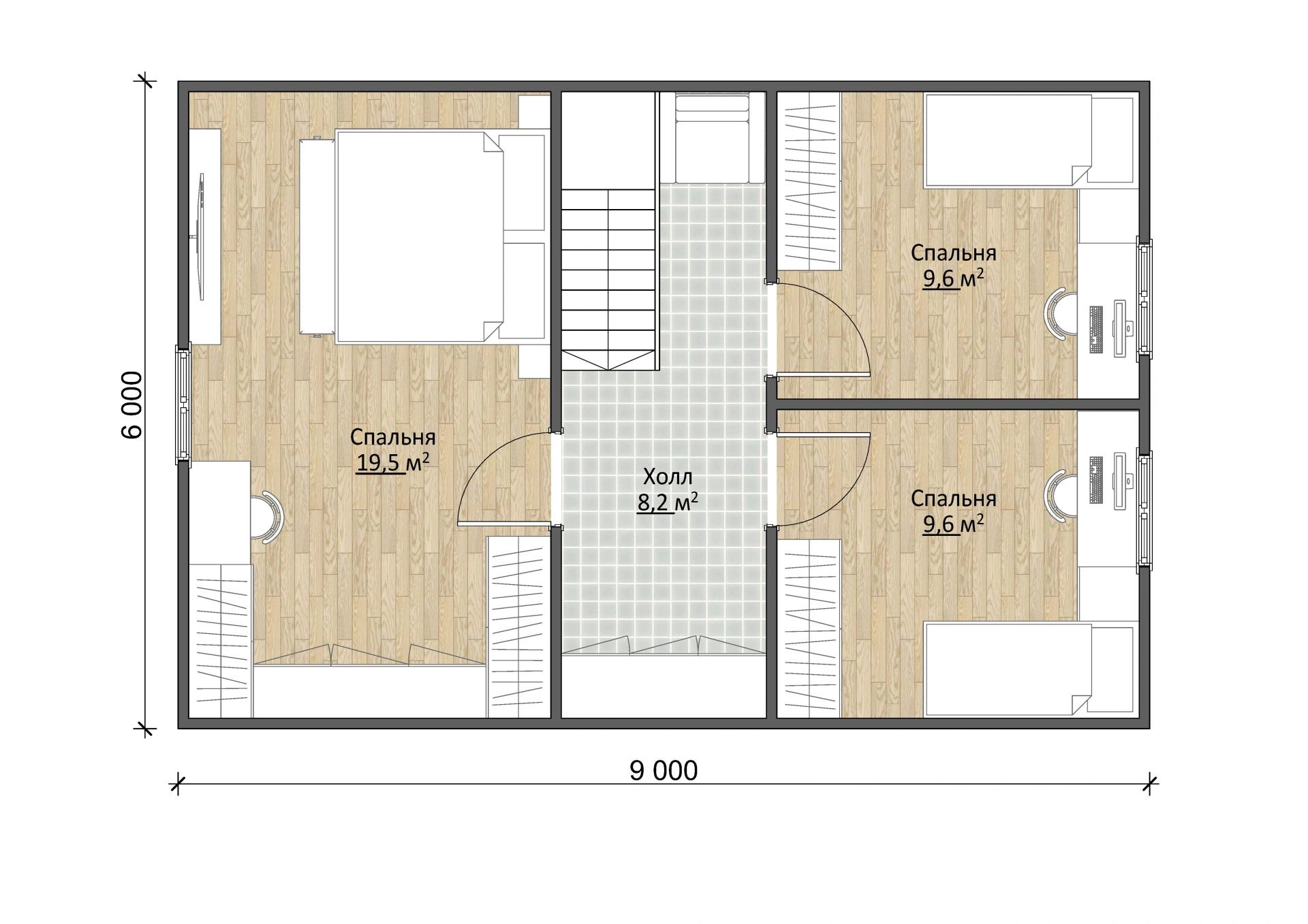 Наверху еще одна просторная комната в 19,6 м² и две поменьше — площадью в 9,5 м².