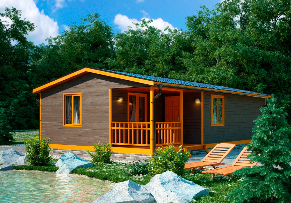 Вместительный одноэтажный садовый дом можно использовать как дачный вариант на лето или небольшой коттедж для постоянного проживания. Благодаря средним габаритам 6х9 м его легко интегрировать на участке, а удачная планировка с обособленными помещениями удобна при оформлении интерьеров.