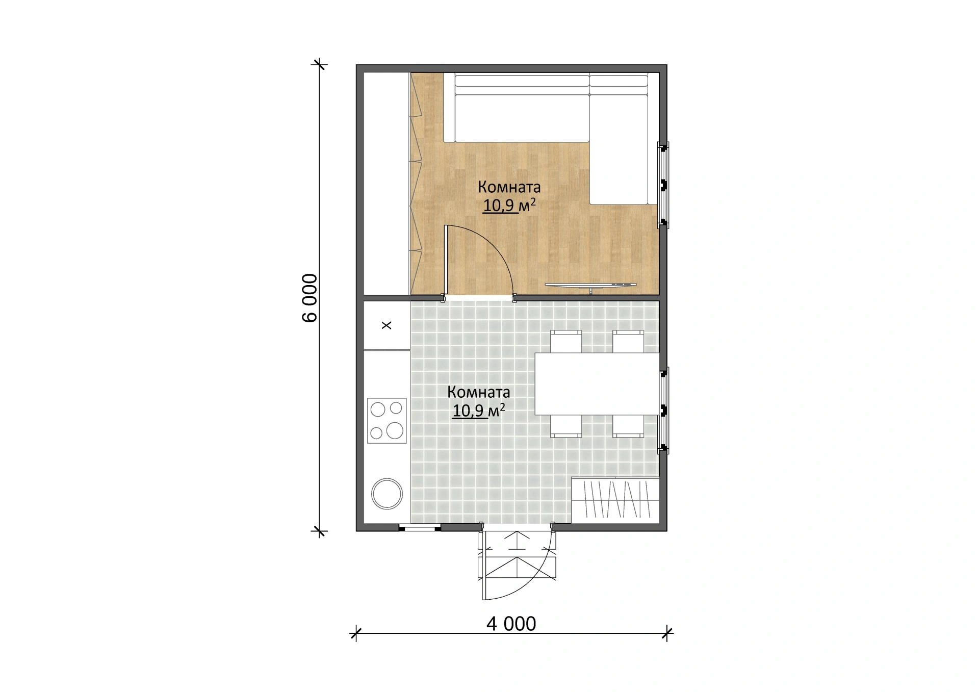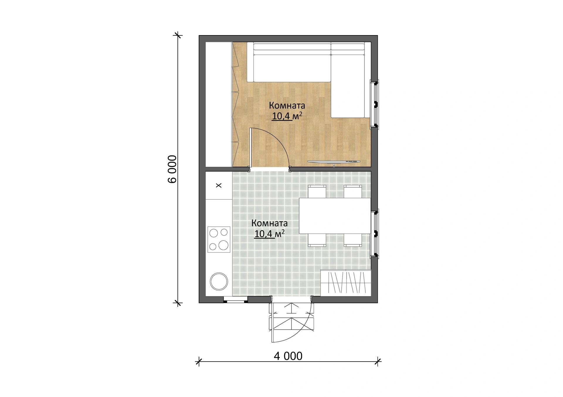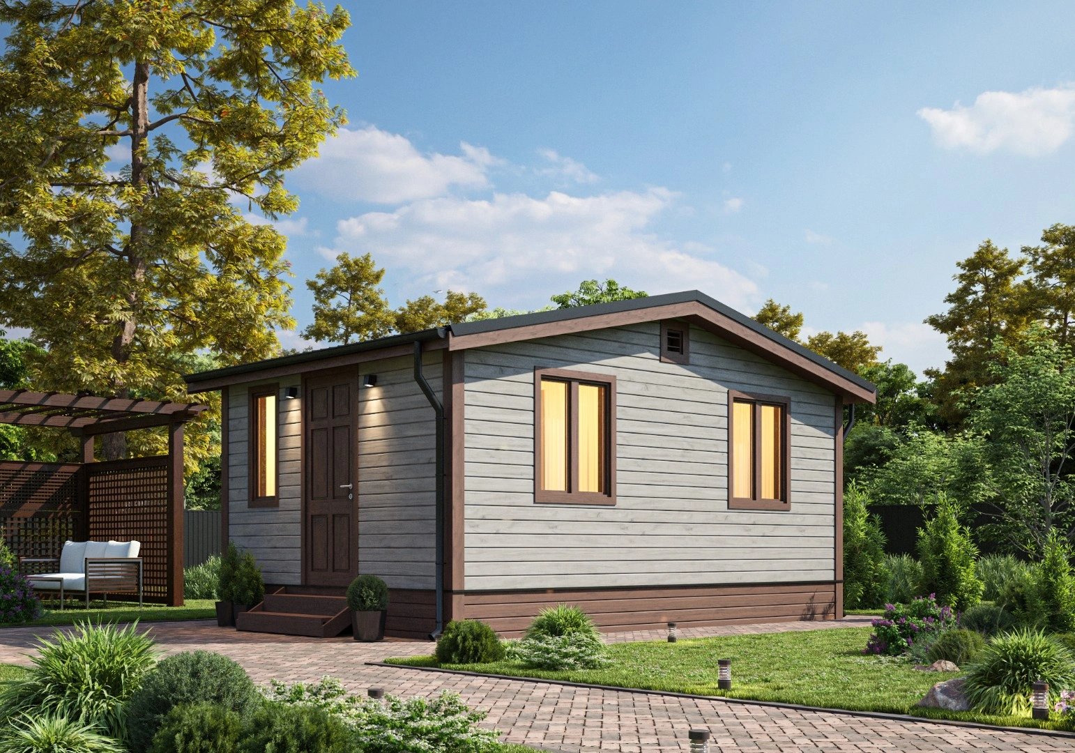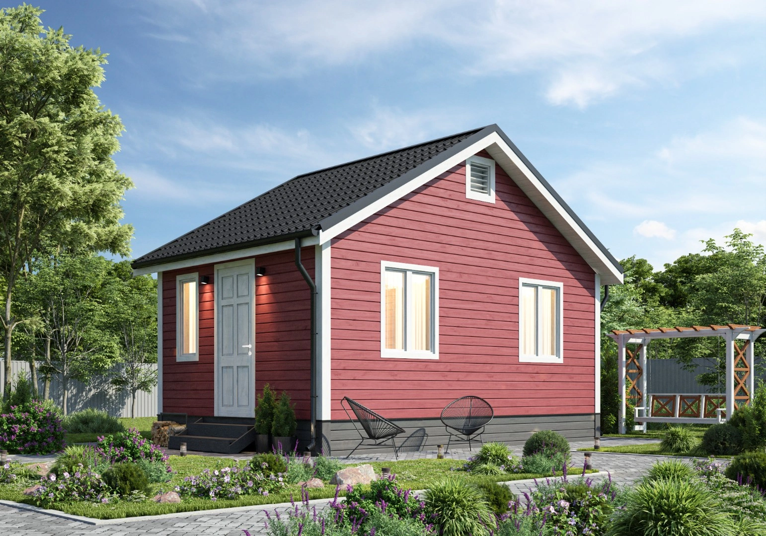 Одноэтажный садовый дом предназначен для временного проживания. Благодаря практичной прямоугольной форме и небольшим размерам (6х4 м) его будет несложно разместить на загородном участке.
