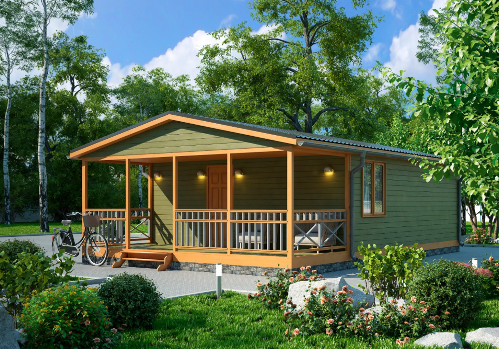 Строительство такого дома занимает от 3 дней, срок зависит от комплектации. При заказе можно выбрать тип фундамента, форму крыши, материал отделки внешних стен.