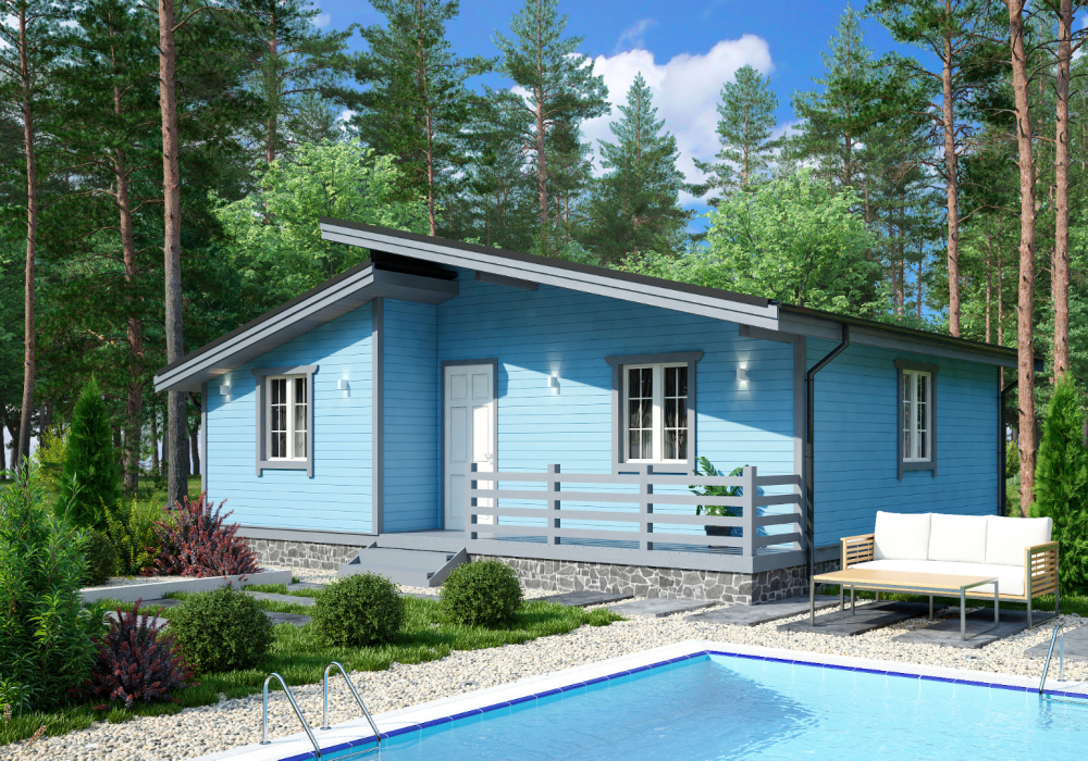 Планировка подразумевает кухню-гостиную площадью 20 м2. Эта зона является сердцем дома, где можно заниматься приготовлением кулинарных шедевров, принимать пищу и отдыхать. Далее идет комната площадью 10,3 м2, которую можно использовать как кабинет, игровую или даже комнату для гостей, в зависимости от потребностей и предпочтений заказчика. В доме есть уютная спальня площадью 11,6 м2, где можно отдохнуть и восстановить силы. В спальне достаточно места для кровати, прикроватных тумбочкек, шкафа и дополнительных решений для хранения. Ванная комната площадью 3,2 м2 может быть оснащена всеми необходимыми удобствами: душ или ванна, раковина и туалет. Места для хранения могут быть включены в пространство. К дому также пристроена терраса площадью 5,4 м2, на которой одно удовольствие отдыхать с семьей.