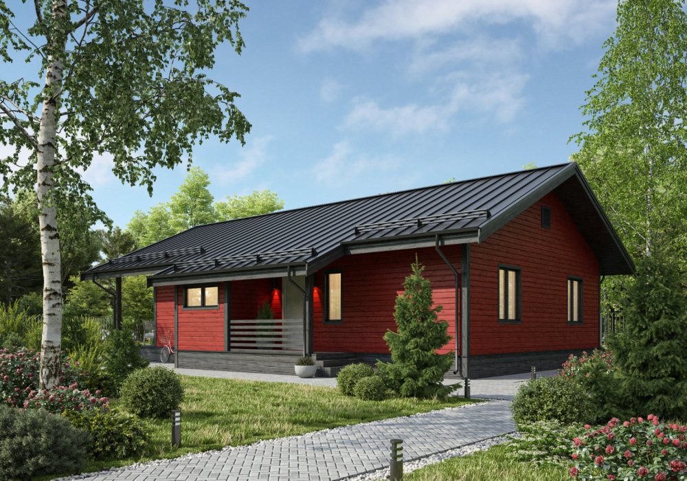В лицевой части коттеджа расположена просторная терраса площадью 21,2 м2, на которой можно поставить садовую мебель и весело проводить время с друзьями и семьей. С нее заходим на кухню, объединённую с гостиной и занимающую 26,2 м2.