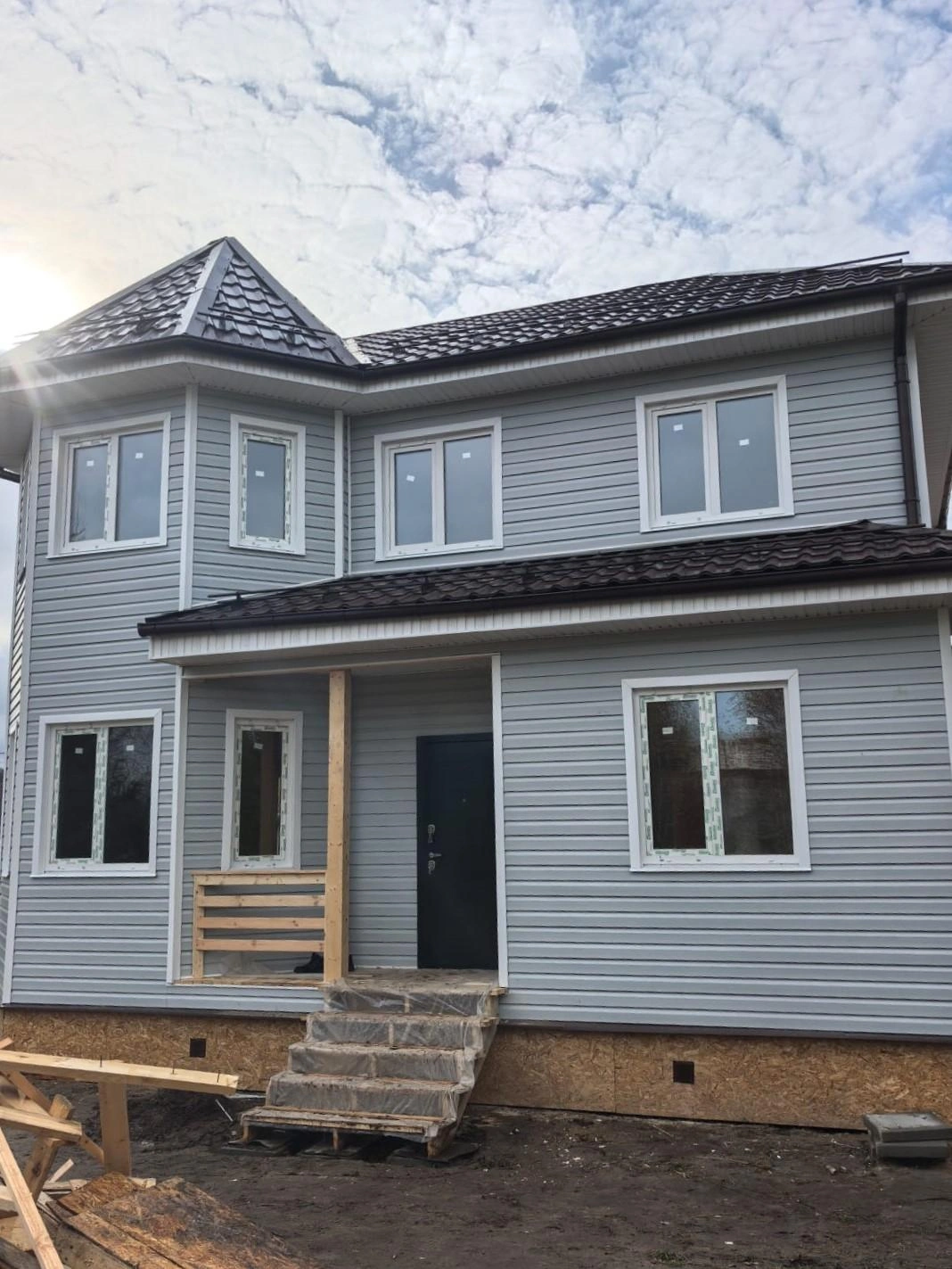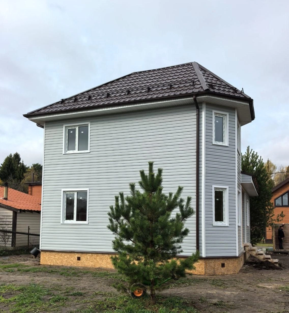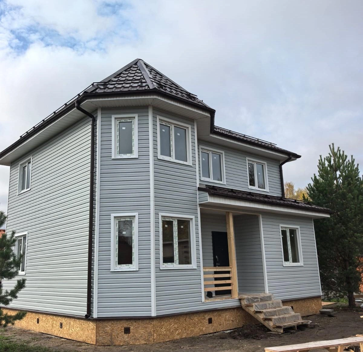 Свайно-винтовой (сваи D=108 м, L=2500 мм). Нижняя обвязка — труба профильная металлическая 120х80 мм. Гидроизоляция фундамента — рубероид в два слоя. Монтажная доска ПМК обработана огнебиозащитой. Отделка фундамента дома ОСП-9 по обрешетке П/м, H=400 мм. По фундаменту установлены отливы (цвет белый).